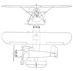 The Sport's main undercarriage was fixed and of wide track, with the wheels on separate axles mounted on the lower fuselage longerons, as were the drag struts. Legs, including oleo struts, were mounted on the forward wing struts at points reinforced by short struts to the upper and lower longerons.[2]