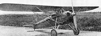 The wing was a two spar structure, rectangular in plan out to rounded tips. The spars were wooden (spruce) but the ribs metal (duralumin). Chrome-molybdenum steel, N-form struts from the spars attached the wing to the lower fuselage, assisted centrally by a short cabane. Chrome-molybdenum steel was used structurally throughout the rest of the airframe, including the differential ailerons.[1][2]