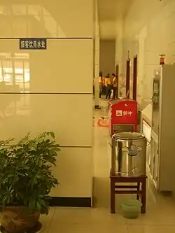 An instant hot water dispenser or boiling water tap is an appliance that dispenses water at about 94 °C (201 °F) (near-boiling). There are hot-only and hot and cool water models, and the water may be filtered as well as heated. Instant hot water dispensers became popular in the 1970s. Instant hot water dispensers are very similar to portable shower devices; the latter is fitted with a heating element and quickly heats up water, once a switch has been activated.