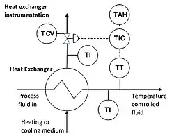 • In industrial applications gaseous or liquid fluids may be heated or cooled. This duty is undertaken in a heat exchanger, whereby the fluid is heated or cooled by heat transfer with a second fluid such as water, glycol, hot oil or another process fluid (the heating or cooling medium).[5][4] Temperature control is used to maintain the desired temperature of the first fluid. A temperature sensor transmitter (TT) is located in the first fluid at its outlet from the heat exchanger. This measured temperature is fed to the temperature controller (TIC) where it is compared to the desired set point temperature. The output of the controller, which is related to the difference between the measured variable and the set point, is fed to a control valve (TCV) in the second fluid to adjust the flow of the heating or cooling medium.[1] In the case of a fluid being cooled, if the temperature of the fluid rises the temperature controller acts to open the TCV increasing the flow of the cooling medium which increases the heat transfer and reduces the temperature of the first fluid. Conversely if the temperature falls the controller acts to close the TCV which reduces the heat transfer increasing the temperature of the first fluid. In the case of heating medium with the falling temperature of the first fluid the controller would act to open the TCV to increase the flow of heating medium thereby raising the temperature of the first fluid. The controller (TIC) may also generate high (TAH) and low temperature (TAL) alarms to warn operating personnel of a potential problem.[4]