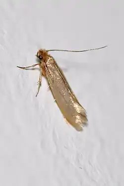 The Casemaking Clothes Moth has blurred dark spots on their wings. These moths avoid light as they prefer dark areas, such as storage rooms and closets, and "tend to live in corners or in folds of fabric”.[16] Casemaking Clothes Moths are known to eat stored wool, hair, fur, silk, felt, and feathers.[16]