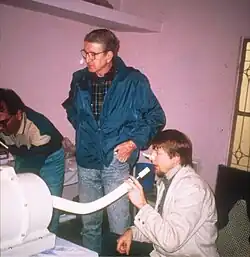 IMCB members (L to R) Ramana Dhara, Jerry Havens, Birger Heinzow calibrate a spirometer Jan 1994