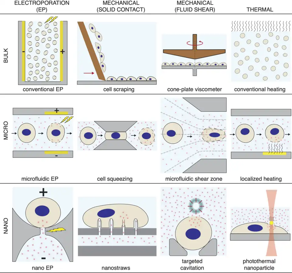 - Fluid shear (usually via microfluidics or cavitation)