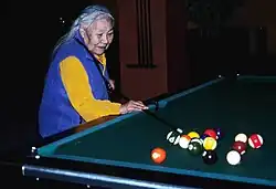 Inuk artist Kenojuak Ashevak playing pool billiards in a hotel in Berlin (2004)