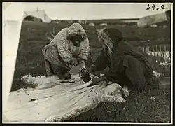 In addition to this, the households that Inuit women were expected to help construct and care for could range from igloos, to semi-subterranean sod houses, to tents in the summer months.[11] This required an understanding of complex architectural concepts, as well as the principles of insulation. A good amount of strength was required to construct Inuit shelters. Because of this, Inuit women often worked together and enlisted the help of men to build their homes. For both practical and social purposes, these houses would be built close together or were made large enough for more than one family to live in.[12]