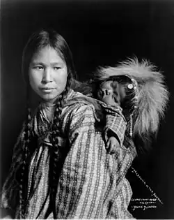 Kinship is an important factor to an Inuk child's cultural belonging. From birth, children are introduced to their duties and ties of kinship.[14] One way Inuit achieve this is by the practice referred to as name-soul. After a member of the family has passed away, their name is used as the name for a child of the same family line.[15] The name provides a child with a cultural tie, belonging within their community, and personal identity.[16] In addition, name-soul allows for prior family members to carry on their legacy in their family lineage even after passing. The children are raised in a family-oriented environment, as their name serves as a reminder that the group comes first. There were no boy's and girl's names in Inuit culture, so it was common for a girl to have the name of her grandfather, for example.[10]