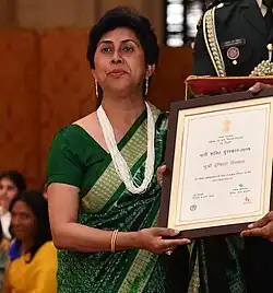 In March 2019, she was conferred India's highest civilian award for women, the Narishakti Puruskar "2018", by President Ram Nath Kovind, for her contributions to the women's empowerment in defence R&D and for her work on bulletproof vests and other protective systems for India's security forces.[2][3] The award was conferred at the Presidential Palace. Prime Minister Narendra Modi was present.[4] She has also been conferred the 'Agni Award for Excellence in Self Reliance' and the 'High Energy Material Society of India (HEMSI) Team Award for Meritorious Service'. The bullets can be used in AK-47 rifles and they "reduce fatalities".[1]