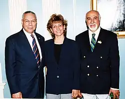 In this 2004 photo, former U.S. Secretary of State Colin Powell stands with then-National Olympic Committee of Iraq executive committee member Dr. Iman Sabeeh, center, and then-newly elected President of the NOCI Ahmad al-Samarra'i.