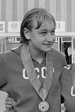 Irina Valentinovna Pozdnyakova (Russian: Ирина Валентиновна Позднякова; born 29 April 1953) is a retired Russian swimmer. In 1966, aged 13, she set a world record in the 200 m breaststroke. The same year she won a silver medal at the 1966 European Aquatics Championships.[1][2][3]