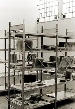 • Archivio (1991) was executed over the duration of Milan's annual festival of the arts, Milano Poesia, curated by Gianni Sassi. "Archivio" showed the process and performance of encasing international daily newspaper cuttings in hundreds of thin slabs of wax and ordering them onto steel shelving. Visitors browsed through the slabs, rearranging them and breaking some. Over the duration of the show the archive was transformed into a collection of disorder. Archivio was reinstalled a year later in Prague.[26] The act of encasing objects in wax would remain a theme in Haeussler's work to this date. Examples are stacks of wax-tablets that encase the laundry of children and adults, arranged into constellations of family relationships, or panels of gauze-curtains and dresses in which the fabrics' color and texture shimmers through the enclosing wax matrix; they appear as large, ethereal paintings.[27]