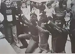 In the late 1970s and early 1980s, the INLA developed into a modestly large urban guerrilla organisation in Northern Ireland, operating primarily from the Divis Flats complex in west Belfast, which, as a result, became colloquially known as "the planet of the Irps" (a reference to the IRSP and the film Planet of the Apes).[17] The brigade went through a number of leaders in its first year but its first full-time Officer commanding (OC) was Ronnie Bunting whose father was Ulster Loyalist politician and British Army Major Ronald Bunting who was a follower of Ian Paisley. The Belfast INLA was the most active operational area of the INLA, and their capabilities were enhanced after obtaining a number of AK47s from the Middle East via a connection with the Palestine Liberation Organization (PLO) in 1978. which were first used by the Belfast INLA in August 1978, injuring a number of British soldiers.[18] After Bunting was shot dead along with an IRSP member by the UDA in 1980,[19] Gerard Steenson became OC of the INLA in Belfast. Steenson became the brigades Operations Officer in 1980 & was OC from 1981 - 1983. Around the same time period Jimmy Brown (Irish republican) became the brigades Intelligence officer (I/O), Thomas "Ta" Power, Hugh Torney Martin "Rook" O'Prey & future supergrass Harry Kirkpatrick was also highly active in the brigade during the early 1980s.[20] This was the most active period in the INLA's history.[21] Both Steenson & Brown would later go on to form the IPLO & attack their former comrades in the INLA. In September 1982 an INLA unit detonated a bomb in Divis Flats aimed at killing British soldiers but instead killed two young local boys aged 14 & 12 and a British soldier.[22][23] This bombing prompted an angry response from residents of the Divis Flats, and about 200 women held a protest march at the IRSP's offices on the Falls Road.[24] Eleven days after the Divis Flats bombing an INLA unit carried out another bomb attack against the British Army in west Belfast, this time killing a British soldier with a booby-trapped bomb attached to a security gate.[25] After this attack the INLA warned that it would increase its bombing attacks on British security forces.[26]