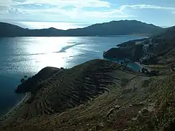 Isla del Sol (Spanish for "Island of the Sun") is an island in the southern part of Lake Titicaca. It is part of Bolivia, and specifically part of the La Paz Department. Geographically, the terrain is harsh; it is a rocky, hilly island with many eucalyptus trees. There are no motor vehicles or paved roads on the island. The main economic activity of the approximately 800 families on the island is farming, with fishing and tourism augmenting the subsistence economy. Of the several villages, Yumani and Challapampa are the largest.[1]