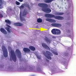 The coccidian parasite Cystoisospora belli infects the epithelial cells of the small intestine, and is the least common of the three intestinal coccidia that infect humans (Toxoplasma, Cryptosporidium, and Cystoisospora).