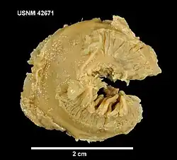 This is a robust sea anemone with a disc diameter of 10 to 12 cm (4 to 5 in).[3] The pedal disc is well-developed and the column is short and smooth, divided into a scapus and a scapulus region. The sphincter muscle is strong and there are two siphonoglyphs. The tentacles are short and arranged in multiples of six, the outer ones being shorter than the inner. The colour is variable.[4]