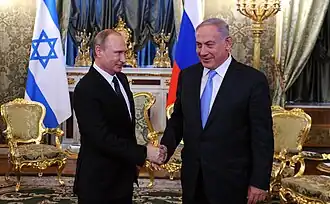 Relations between Israel and Russia further improved after the Russian military intervention in Syria in September 2015. From then until July 2018, Israeli Prime Minister Benjamin Netanyahu and Putin met a total of nine times.[43] In October 2015, Israel and Russia held meetings to coordinate over Syria, and avoid accidentally clashing or scrambling each other's communications while operating over the country.[44][45]