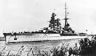 The commander of the 1st Division briefly transferred his flag to Gorizia's sister ship Pola on 31 December, before returning to Gorizia on 3 June 1935. The ship was sent to Spanish waters on 24 July 1936 to evacuate Italian nationals from the port of Gijón during the Spanish Civil War. She passed through the Strait of Gibraltar on 29 July and arrived in Gijon on the 31st. After embarking the Italian nationals on 1 August, Gorizia cruised to Le Verdon-sur-Mer, France, where they were disembarked between 1 and 4 August. The next day, the ship departed for Germany, arriving in Kiel on 8 August for a naval review with the German heavy cruiser Admiral Graf Spee, the light cruiser Königsberg, and the British cruiser HMS Neptune. Gorizia remained in Kiel to show the flag during the 1936 Summer Olympics, as the sailing events for the Berlin games were held in Kiel.[3]