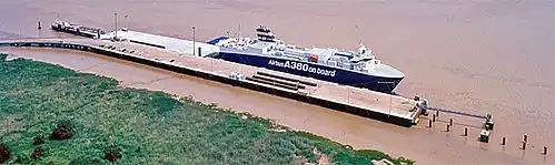 The front and rear sections of the fuselage are loaded aboard one of the fleet in Hamburg in northern Germany, after which the ship travels to Mostyn in the United Kingdom. The wings, which are manufactured at Filton in Bristol and Broughton in North Wales, are transported by barge on the River Dee to Mostyn docks, where the ship adds them to its cargo.[5][6] The Ciudad de Cadiz went aground without cargo on sandbanks outside Mostyn in January 2013, when its moorings burst during high winds.[7]