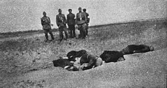 During the Holocaust, more than a million Jews were murdered in Ukraine. Most of them were shot in mass executions by Einsatzgruppen (death squads) and Ukrainian collaborators.[2] In 1897, the Russian Empire Census found that there were 442 Jews (out of a population of 3,032) living in Ivanhorod, a village today in the Cherkasy Oblast, central Ukraine.[3][4] In 1942, a mass shooting by Einsatzgruppen south of the town killed an unknown number of victims. Part of the massacre is depicted in this photograph. After the war, the execution site was used as a field of a collective farm.[4]