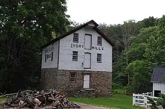 Ivory Mills is a 14-acre (5.7 ha), historic grist mill complex located at White Hall, Harford County, Maryland, United States. It consists of six standing 19th century frame buildings and structures: mill, miller's house, barn, corn crib, carriage house, and chicken house. The property also includes the ruins of a stone spring house, and the stone abutments of a frame, Federal-era covered bridge. The focus of the complex is the three-story stone and frame mill building built circa 1818. The ground story is constructed of coursed stone rubble, and the upper stories from clapboard. The family first started a mill on this site in 1781; this particular mill ceased production in the 1920s.[2]