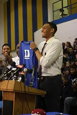 During the season, Parker established the Simeon single-game scoring record with 40 points in 21 minutes of play to go along with 16 rebounds and 6 blocked shots against Perspectives High School.[33][34][35] As a junior in high school, he received offers from Duke, Kansas, BYU, Kentucky, UNC, and others.[36] On February 17, Parker and Simeon won the Public League championship by defeating Curie Metropolitan High School 53–49.[37][38] Both the semifinals and finals were broadcast on ESPN3.[39] Coaches Izzo, Krzyzewski, Matta, and Weber as well as Mayor Emanuel and cadres of their assistants were among those in attendance to see this March 6 IHSA sectional semifinal against Young won by Simeon 52–42 in which Parker led the way with 18 points and 6 rebounds.[40][41][42] In the days prior to the state final four, Parker stated that although Coach Weber had been fired, he remained interested in Illinois and other in-state schools such as DePaul and Northwestern.[43] Parker had 15 points in the March 17 championship game 50–48 victory over the Sterling Brown-led Proviso East High School,[44][45] resulting in a 33–1 junior year record for Simeon.[46] The state semifinals and the finals were broadcast live on ESPN3.[39] For the season, Parker averaged 19.5 points, 8.9 rebounds, 4.9 assists, 3.3 blocks and 1.4 steals per game[46][47][48] or 20.4 points, 9.2 rebounds, 5.1 assists, 3.4 blocks and 1.5 steals per game,[49][50] depending on the source, while shooting 55 percent from the field, 39 percent from 3-point range and 72 percent from the free-throw line.[46][47][49] Following the season, he was featured in a May cover story in Sports Illustrated with the title "The Best High School Basketball Player since LeBron James Is . . . Jabari Parker but There's Something More Important to Him than Instant NBA Stardom: His Faith". The story presented his humility and noted that he is conflicted on his decision to serve as an LDS Church missionary.[7] Parker announced that he anticipated trimming his potential schools to a list of five by the end of the summer so that he could plan official visits.[51]
