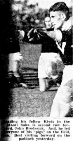 Brodrick did not however go on the tour with the Bay of Plenty side as he was selected in the Māori All Blacks team to tour Australia from 2 July to mid August.[50] The Gisborne Times reported that the average age of the team was 24 and that Brodrick's height was 6 foot 1, and weight 14 stone. Also in the side was 30 year old George Nēpia, Jack Hemi, Tommy Chase, Hawea Mataira, and Len Kawe. All of whom would convert to rugby league relatively soon after the tour, with Nēpia, Chase, and Kawe all playing with Brodrick at Manukau, while Mataira joined the City Rovers club also in Auckland.[51][52]