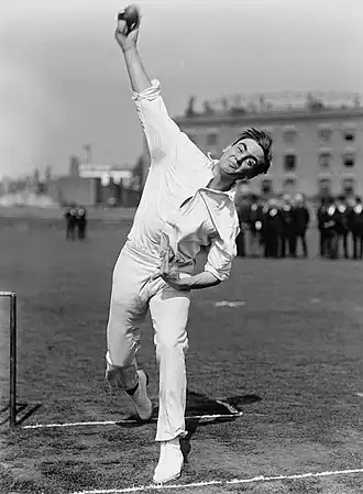Crawford began the tour well, taking seven wickets in the opening first-class match against Western Australia.[14] In the second game, he scored 114 runs in 58 minutes against South Australia, the fastest first-class century scored in Australia until then, followed by bowling figures of five for 40 in the second innings.[14][43] Crawford contributed little more with bat or ball in the lead-up to the Test series;[14] in England, the cricketer Gilbert Jessop wrote an article suggesting that Crawford had become an "unsound" batsman.[49] He scarcely bowled in the first Test, won by Australia,[14] and both the English and the Australian press were critical of his bowling.[50] Frederick Fane, the acting-captain of England, seemed to share this view in the second Test, withholding Crawford from the attack for some time.[51] However, Crawford took five for 79 in the first innings helped to restrict Australia on a good batting pitch and took eight wickets in the match as England levelled the series.[52]