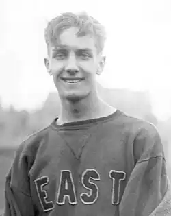 Jack Keller studied at Ohio State University and succeeded sprinter George Simpson as the Ohio State Buckeyes' leading track and field star.[3] As a sophomore in 1931, he won the 220 yard hurdles in 23.5 at the Big Ten conference meet;[4] he was favored in the 120 yard hurdles as well,[5] but was narrowly defeated by Illinois's Lee Sentman in a world-record-equaling 14.4.[6][7][note 1] He then led Ohio State to a second-place finish in the NCAA Championships, winning both the 120 yard hurdles (14.6) and the 220 yard hurdles (23.8) in difficult conditions and tying for highest points scorer of the meet.[10][11][12]