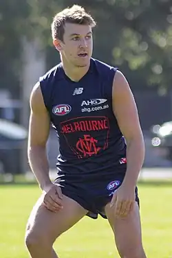 Trengove was recruited by the Melbourne Football Club with their second selection and the second overall in the 2009 national draft.[15] He made his debut in the fifty-six-point loss against Hawthorn at the Melbourne Cricket Ground in the opening round of the 2009 season, in which he recorded twenty-three disposals, two marks and two tackles, and was named in the best players for Melbourne.[16] In his fifth match, he received the round five nomination for the AFL Rising Star after he recorded twenty-four disposals, six marks, four tackles and two goals in the fifty point win against the Brisbane Lions at the Melbourne Cricket Ground.[17] He played the first nine matches of the year before he was rested for the round ten match against Geelong at Skilled Stadium, with the previous week's match being played in hot conditions in Darwin.[18] He missed three weeks of football in July with a hip injury.[19] He returned from injury through the Victorian Football League (VFL) with Melbourne's affiliate team, the Casey Scorpions.[20] He returned to the senior side in round nineteen for the twenty-nine-point win against Richmond at the Melbourne Cricket Ground and played the remainder of the year to finish with eighteen matches and average nineteen disposals a match.[21] He was considered one of the early favourites to win the rising star in the betting markets,[22] and ultimately finished fourth overall in the award.[23]