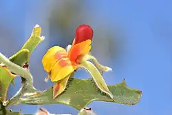 Jacksonia anthoclada is an erect, single-stemmed shrub that typically grows up to 1.5–2.5 m (4 ft 11 in – 8 ft 2 in) high and 0.5 m (1 ft 8 in) wide, its branches yellowish-brown. Its phylloclades are elliptic to egg-shaped with the narrower end towards the base, 28–133 mm (1.1–5.2 in) long, 11.5–24 mm (0.45–0.94 in) wide and hairy with prominent veins. The nodes on the edges of the phyllodes are sharply-pointed. The flowers are arranged singly on the nodes of the phyllocades on a pedicel 3.3–5.3 mm (0.13–0.21 in) long. There are egg-shaped bracteoles 2.7–7 mm (0.11–0.28 in) long on the pedicels but that sometimes fall off as the flowers open. The floral tube is 1.2–2.1 mm (0.047–0.083 in) long and the sepals are membranous, 11.7–17 mm (0.46–0.67 in) long and 2.5–4.8 mm (0.098–0.189 in) wide. The petals are yellow-orange with red markings, the standard petal 12.2–13.2 mm (0.48–0.52 in) long, the wings 6.3–6.5 mm (0.25–0.26 in) long, and the keel 7.3–8.5 mm (0.29–0.33 in) long. The stamens have green to pale pink filaments 9–13 mm (0.35–0.51 in) long. Flowering occurs from November to April, and the fruit is a woody, densely hairy, broadly elliptic pod 11.6–16.9 mm (0.46–0.67 in) long and 6.3–7.8 mm (0.25–0.31 in) wide.[2][3]
