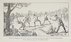 On 27 April 1578, Caylus was involved in the 'Duel of the Mignons' between favourites of Henri III and those of the Duke of Guise. Representing Henri were Caylus, Maugiron and Livarot; representing Guise were Ribérac, Schomberg and Entraguet. The two sides met at 5am near the horse market at Porte Saint-Antoine to fight with rapiers. The cause of the quarrel was obscure, a dispute over woman started by Caylus. Livarot and Maugiron were Caylus' second and third respectively, while Schomberg and Ribérac were second and third to Entraguet. Caylus was wounded with 19 sword blows in the fight that followed, while Maugiron, Ribérac and Schomberg were killed.[22] It was reported that each time he was struck Caylus cried out 'Long live the king'.[23] Fifteen days after the duel, the Guise family at large departed court.[24] The fight was denounced by contemporaries as a senseless waste of life. Though Brantôme praised the fight as a 'beautiful combat'.[23] L'Estoile who compiled parisian remembrances of the event, found that almost every pamphlet praised Entraguet for his victory, while denouncing Henri's favourites as 'sodomites'.[23] Henri visited him daily at the hôtel de Boisy as he neared the end of his life, ordering that traffic outside the hôtel be stopped to afford them quiet together.[25] Desperately Henri offered 100,000 livres to any surgeon who could save him.[23] After having lingered for 33 days, he died on 29 May.[5]
