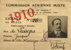 Jacques Benjamin de Lesseps was a French aviator born in Paris on 5 July 1883, killed in an air accident presumably on 18 October 1927 along with his flight engineer Theodor Chichenko. He was the son of French diplomat and entrepreneur Ferdinand de Lesseps. In 1910 he married Grace Mackenzie, daughter of Sir Willam Mackenzie.