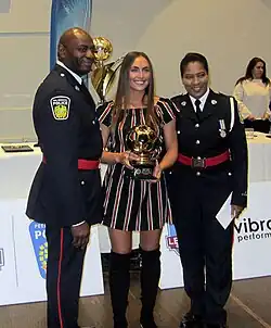 She did not play in the 2017 season, returning to the team in 2018.[22][23] In the first game of the season on September 8, 2018, she broke the single-game OCAA scoring record, scoring nine goals in a 16-0 victory over the Lambton Lions.[24][25][26] For the 2018-19 season, in addition to being named Fanshawe's Athlete of the Year,[27] she was named an OCAA All-Star, a CCAA All-Canadian for the third time, and the OCAA Women's Soccer Player of the Year, after finishing as the league scoring champion with 30 goals,[28][29] breaking the OCAA single-season regular season goals record,[30][31] as well as being named the CCAA Women’s Soccer Player of the Year.[32][33][34] She was also named the OCAA Female Athlete of the Year, becoming the first Fanshawe woman to win the honour.[35][36][37] With Fanshawe, she helped them win their first OCAA championship title in nine years, earning Tournament MVP honours,[38] as well as helping them win bronze at the CCAA nationals.[39]