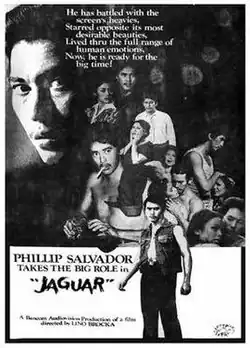 Jaguar is a 1979 Filipino neo noir crime film directed by Lino Brocka from a story and screenplay written by Jose F. Lacaba and Ricky Lee.[1] It was entered into the 1980 Cannes Film Festival.[2] The story is based on the real-life "Brown Derby Shooting" in 1960 as documented by Quijano de Manila in the article "The Boy Who Wanted to Become Society", later republished in the non-fiction crime anthology, Reportage on Crime (1977).[3][4]