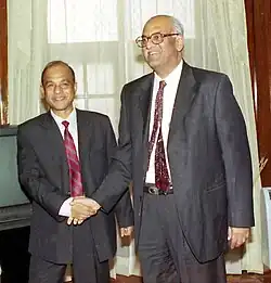 Chowdhury exclaimed at a press briefing after talks with Indian Home Minister Swami Chinmayanand that India was harboring 90 terrorist camps of anti-Bangladesh separatists.[13] He played a controversial role in blaming India for the grenade attacks which took place on 17 August 2005. The Foreign Ministry of Bangladesh said that the Indian newspapers presented a distorted version of his earlier statement and that he actually said that some Indian criminals might have been involved in the countrywide bomb blasts in Bangladesh.[14] Relations suffered between the two countries as the Indian Ministry of External Affairs issued a statement saying "Government of India is deeply shocked and dismayed at the remarks. This is a baseless and scurrilous allegation and is all the more shocking because it has been made against a friendly country[15] and particularly after the two countries have had useful and constructive talks between the Bangladesh Rifles and Border Security Force". He further claimed that Indian militants might have crossed into Bangladesh territory to perform the acts.[16] In a separate incidence reported by BBC, India accused BDR of intruding into their Air Space with a few helicopters, which General Chowdhury denied and said that BDR has one helicopter which was then kept with Bangladesh Army.[17] He accused the Indian Army of supporting Banga Sena, a banned militant group in Bangladesh.[18]