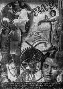 The film was produced by the Sagar Renaissance Theatre, a joint production by G. K. Seshagiri’s Renaissance Theatre and Sagar Movietone.[2] It was directed by R. R. Gautam and G. K. Seshagiri, who was also the owner of The Renaissance Theatre.[3] Manjeri S. Isvaran and R. S. Murthi were assistant directors. The story and dialogues were written by Manjeri S. Isvaran, Dr. V. Raghavan and G. K. Seshagiri. The film was shot at Sagar Studios in Bombay and the photography was done by Rajnikant Pandya and Minoo Billimoria. The audiography was handled by V. M. Desai, Dinshaw Billimoria and Reuben Moses. Roora Mistry took care of the film’s settings while Fakir Mohammad handled the editing. The film was processed by Gangadhar Narvekar and Pranchavan Shukla.[2] While the song book only credits S. Shanmukham as the Nattuvanar in the orchestra, Film News Anandan credits him as just the dance choreographer.[5] Hari Krishnan believes that S. Shanmukham is actually Shanmukhasundara Nattuvanar of Thiruppanandal, who was an associate of Vadivelu Pilai, the duo’s choreographer before he died in 1937.[3][6] G. K. Seshagiri played the hero, Rajagopalan, while Varalakshmi of the Varalakshmi-Bhanumathi duo was hired to play the heroine, Jalaja. Production began in 1937 in Bombay and on 3 November, Varalakshmi died suddenly.[3] Her cousin Bhanumathi, known as Kumbakonam Bhanumathi, was asked to replace her role, which she accepted.[3][7][8] The film had a second title, Natya Mahimai, meaning the glory of dance.[2][3][8] K. S. Gopalakrishnan, a congress party worker turned film director played the Mudaliar.[2] He is often confused with another film director, K. S. Gopalakrishnan.[9] Bhudo Advani, a Bengali actor played one of the Mudaliar’s servants.[2] Kumari Rukmani and her mother Nungambakkam Janaki played Rukmini and Duraikannu, Jalaja's sister and mother respectively.[2][4][10] Lakshmi, who played Rajagopalan’s wife, Lalitha, was introduced in this film.[3]