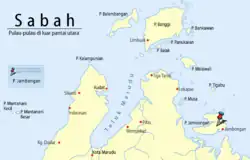 Jambongan Island (Malay: Pulau Jambongan/Jembongan; Bajau-Suluk: Jambangan) is located on the northern coast of Beluran District, Sabah in Malaysia. With an area of 113 square kilometres (44 sq mi), it is considered the second largest island in Sabah,[3][4] located in Paitan Bay of the Sandakan Division.[5] Its main settlement, the Jambongan town, is located on the southeast part of the island. The highest point on the island is Buli Gantungan Hill (Malay: Bukit Buli Gantungan), at a height of 156 metres (512 ft).[1] As of 2019, the island has an estimated population of 5,000.[4]