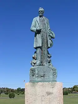 A statue of Bradley stands in front of the Paramount Theater and Convention Hall complex in Bradley Park. Constructed shortly after his death to mark the 50th anniversary of the city's founding, a campaign began in 2017 to remove the statue based on Bradley's history of instituting segregation on the beach and boardwalk that he owned. Bradley was pressured into this by hotel owners and a campaign by the Asbury Park Daily Journal upon complaints of White visitors in 1885. Previously, the oceanfront was open to all.[6] Bradley openly explained his motivations to Black groups. He felt that should Asbury Park remain integrated and cease to attract White visitors, economic ruin would result. The city's economy was negatively impacted in the 1970s when the number of White visitors declined after the beach and boardwalk were reintegrated. Members of the Asbury Park Historical Society acknowledged Bradley's use of segregation but opposed removal of the statue.[7]
