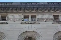 The second story is treated like a mezzanine, with small rectangular windows.[3][23] On the southern elevation, the second story has three square windows, which are flanked by console brackets that hold up the third-floor balcony.[14][3] The brackets extend the whole height of the second floor, an intentional design choice that was meant to make the second floor appear as small as possible.[14] At the second story, the western elevation has one square window, while the eastern elevation has two square windows in the front and four larger windows in the rear.[3]