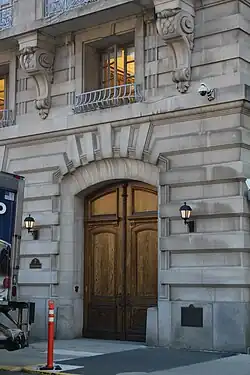 The facade of the first and second stories is made of rusticated blocks of granite.[3] The segmentally-arched carriage entrance faces south toward 91st Street[19] and is closed off by heavy wooden doors.[24] Next to the 91st Street entrance are two segmentally arched windows;[3] both the windows and the carriage entrance are topped by a limestone string course.[23] The main entrance, on the eastern elevation,[13][19][22] was made of glass and iron and was accessed by a covered driveway, which functioned as a porte-cochère.[17][23] There was a small concierge's booth next to the driveway.[14][17][22] A short stoop (now blocked off) ascends from the driveway to the doorways.[23] There is a small pedestrian entrance to the left of the main entrance,[3][17] as well as three segmentally arched windows on the eastern elevation.[3]