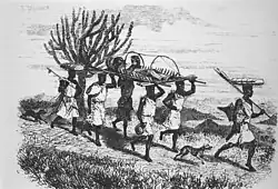 (pages 189–90): On our journey, the stretcher was changed from head to the shoulder of the Waganda, who went at the rate of six miles an hour, jostling and paining my limb unmercifully. The coach and four, as I may term it, was put down every mile, or less, that the bearers might rest, laugh, joke, .... One great difficulty was to make them carry the conveyance so that the country in front could be seen in travelling; this they, for some reason, refused to do, and persisted in carrying me head first, instead of feet (fig 1-10).