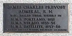 Pembroke's crew were paid off in 1840 and Prevost was transferred as senior lieutenant to HMS Victor, an ageing 18-gun brig-sloop attached to a flotilla bound for the West Indies. Returning to England in 1842, he married Ellen Mary Moresby, daughter of Rear Admiral Sir Fairfax Moresby in October of that year.[2] Thereafter he prolonged his stay in London via a sinecure appointment as Flag Lieutenant to Admiral Sir Charles Rowley who was serving as Commander-in-Chief, Portsmouth. Prevost was promoted to commander in October 1844.[2] Automatic advancement on seniority saw him promoted to admiral in 1880. In later life he served Commissioner for Britain in negotiations to settle the San Juan Island boundary dispute between British Columbia and the United States. Prevost died in London in 1891.
