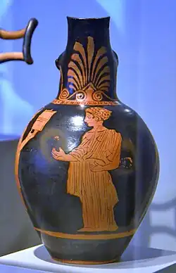 Christie befriended the prominent classical collector Charles Towneley, who encouraged him in the study of Etruscan vase painting. The product of this study was A Disquisition upon Etruscan Vases (1806), printed privately and anonymously, and later republished as Disquisitions upon the painted Greek Vases (1825) under his name, with several sections expanded. [1][4][5][12] The book attempted to prove the origins of the vase's figures in the Eleusinian Mysteries, speculating that the vases were representations of puppets used in religious plays, in which "dark superficies, in which transparent figures were placed," or "opake figures, moved behind a transparent canvas," were used,[11] and that vase painters were hired to "trace [...] these phantasmagoric shadow projections" as funerary memorials for cult initiates. Additionally Christie created a Linnaean system of classification for these vases, now "generally regarded as his more lasting contribution" according to Noah Heringman.[13] The 1810 The Monthly Review assessed Christie's book favourably as "highly interesting to the classical antiquary", though the reviewer notes that it "involves a great variety of curious subjects, all bearing more or less relation to the principal point" and "presupposes in its reader so much acquaintance with the mixed character of heathen mythology".[14] The Gentleman's Magazine was equally impressed, "allow[ing] every credit to the ingenuity and sagacity of Mr. Christie", though they lament that "most of the ancient vases must remain unintelligible [...] therefore, Mr. Christie succeeds in some instances and fails in others, [and] no man living can do more."[15]
