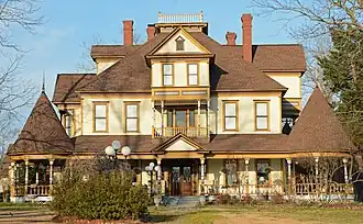 It is a two-story wood-frame Queen Anne-style house with Classical Revival-style details.