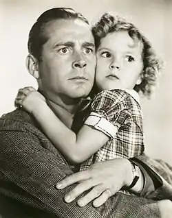 In 1934, Dunn appeared in seven films for Fox. Three of them were also the first three film appearances of six-year-old Shirley Temple.[24] In Stand Up and Cheer!, Dunn and Temple play a father and daughter who perform in one song-and-dance sequence.[25][26] Rather than have the young girl learn a new routine, the producers had Temple teach Dunn the steps to a tap-dance routine she had learned in her dancing school.[27] Their memorable performance prompted studio executives to immediately cast them in a follow-up film, Baby Take a Bow, a remake of the 1928 silent film Square Crooks.[28] Temple again plays Dunn's daughter in this film, whose title was the name of Dunn and Temple's song in Stand Up and Cheer![29][30] Their third[31] film pairing was in Bright Eyes, a vehicle specifically written for Temple and co-starring Dunn as a bachelor pilot and friend of Temple's deceased father who seeks to adopt her. Temple sings "On the Good Ship Lollipop" aboard Dunn's character's airplane in this film.[12] Later that same year, Temple was cast in a small part as Dunn's neighbor in Change of Heart.[32]
