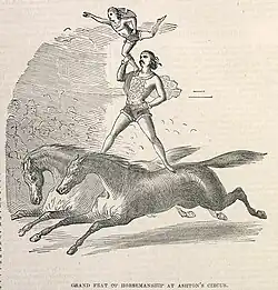 The next mention of the name Ashton in regard to a circus performance, is dated 19 June 1852, when the publication Bell's life in Sydney and Sporting Reviewer records an advertisement titled "CIRCUS! CIRCUS!CIRCUS! Parramatta Olympic Circus" being held in benefit of a Mr. Curran, put on by a "Mr. J. Ashton".[27] The lengthy article tells of the many and varied acts which will be on show. It is perhaps the first time we see the term "Ashton's Entertainments" mentioned in a sentence and is indeed the first time we see that Golden has left behind his birth name and adopted a new identity – James Ashton.