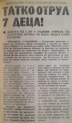 The night before, Annie Mae Richardson, James' wife, had prepared a lunch of beans, rice, and grits for the children. The meal was placed in a locked refrigerator overnight.[3] In the morning the Richardsons left to work at the orange groves 16 miles away.[3] A neighbor, Bessie Reece, was delegated to take care of the children while their parents were at work.[3] The oldest four were enrolled in school;[7] they went home to eat lunch. After they returned to school that afternoon, their teachers noticed they were showing strange symptoms, and the principal immediately took them to hospital.[7] One of the teachers went to check on the three children at home, found them to be sick as well, and they were also taken to the hospital.[7] Word was sent to the parents that just one of their children was ill and that a parent needed to come to the hospital. Both left the groves to go to the hospital, unaware that six of their children were already dead by that time.