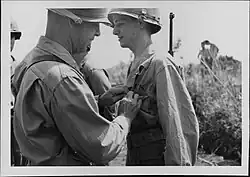 Bradley presents the Purple Heart to a soldier in Okinawa