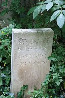 James Sherman died at his home in The Paragon, Blackheath, and was buried in a plain stone chest tomb at Abney Park Cemetery in Stoke Newington, London - the Congregationalist's novel non-denominational garden cemetery of which he was a founder director and trustee. His memorial stone is visible amongst the undergrowth from the westmost path. A modern marker stone has been placed in front of the original in order to distinguish the grave as seen from the path.