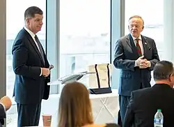 Brett (right) in 2022 with U.S. Secretary of Labor Marty Walsh, who had been Brett's successor in the Massachusetts House of Representatives