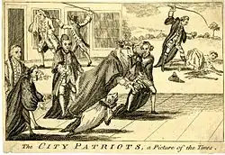 Townsend was elected Lord Mayor of London in 1772. Wilkes had come first in the polls but Sheriff Richard Oliver[6] manipulated the voting process to prevent the election of Wilkes.[7] This created political turmoil in the City and a mob incensed by Townsend's coup rioted outside Guildhall during the ball on Lord Mayor's Day.[8] Townsend's arms were erased from the church of St Helen's Bishopsgate.[9] John Wilkes was eventually elected Lord Mayor in 1774. In 1781, Townsend presented a petition for electoral reform from the Tiverton activist Martin Dunsford.[10] Townsend ran unsuccessfully for Parliament for the City of London in the general election of 1780, and in April 1782, Shelburne arranged for Townsend's election to Parliament for the pocket borough of Calne. As a member he backed some calls for reform, but mainly supported William Pitt the Younger. Shortly before his death in office he had opposed the impeachment of Warren Hastings.[1]
